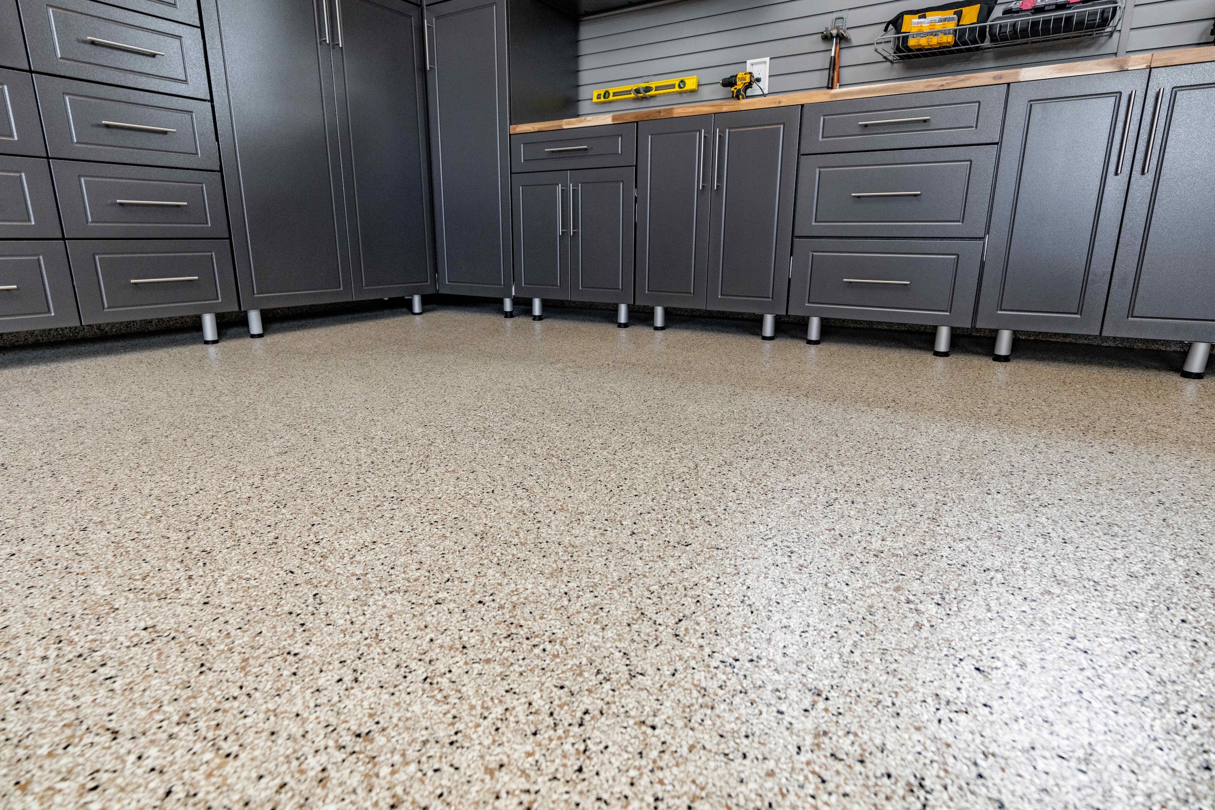 Custom garage cabinets create real zones. Not just places to stash stuff, but places where things actually belong. Professional concrete floor coatings make the space easier to use, easier to clean, and easier to live with year-round.